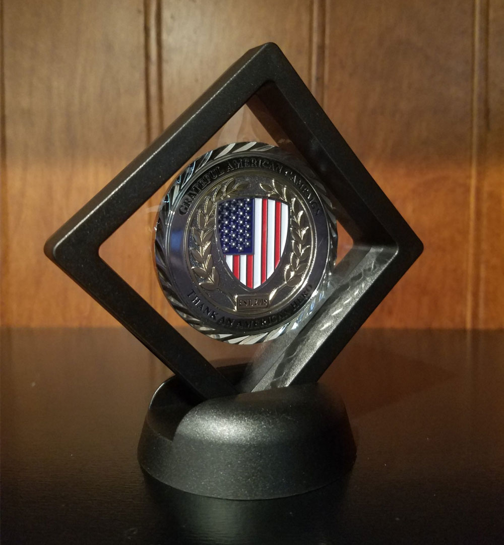 Note: Image to the LEFT displays the 2 inch Grateful American Campaign (GAC) Challenge Coin. Challenge Coin not included with purchase of Floating Display Case.